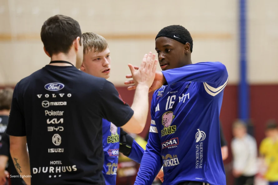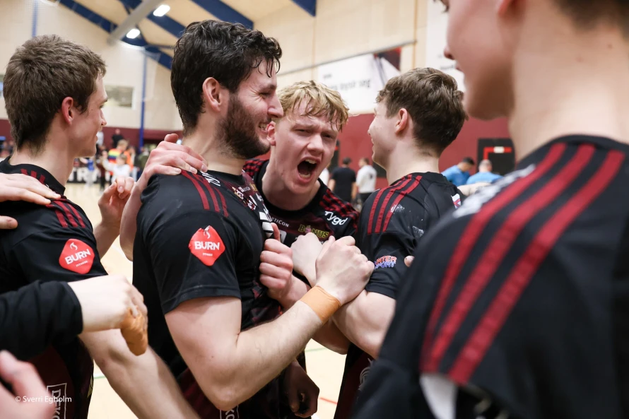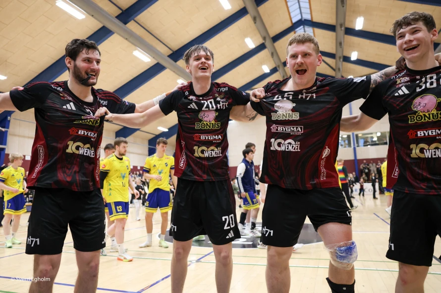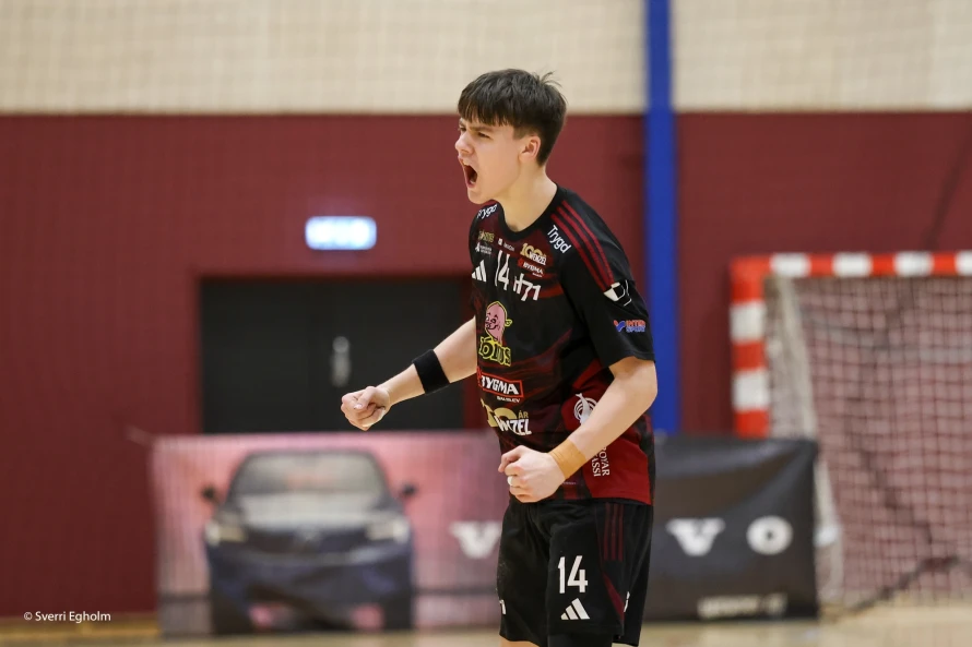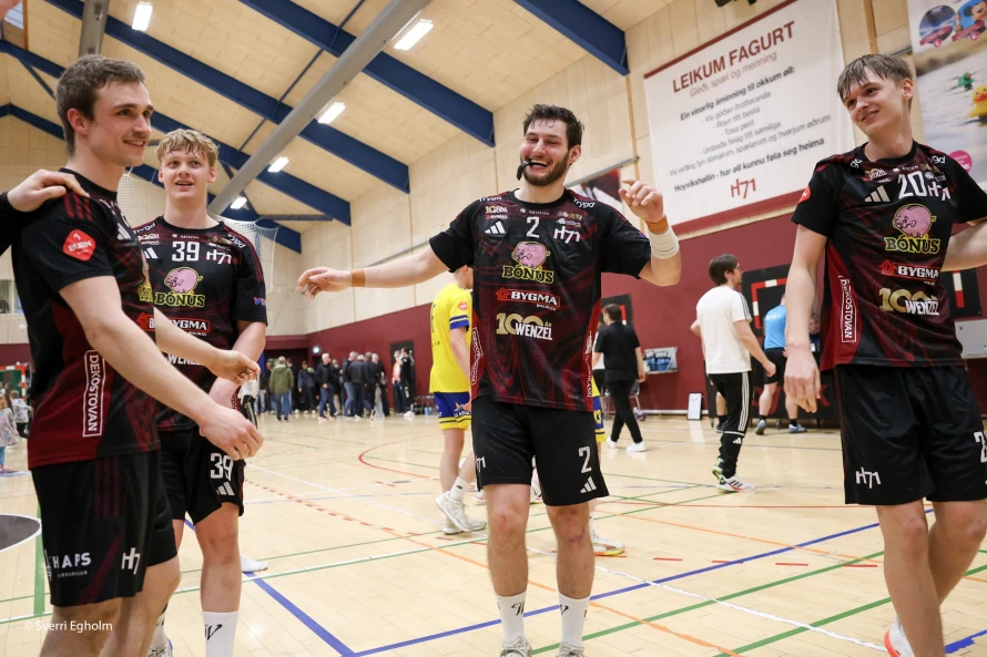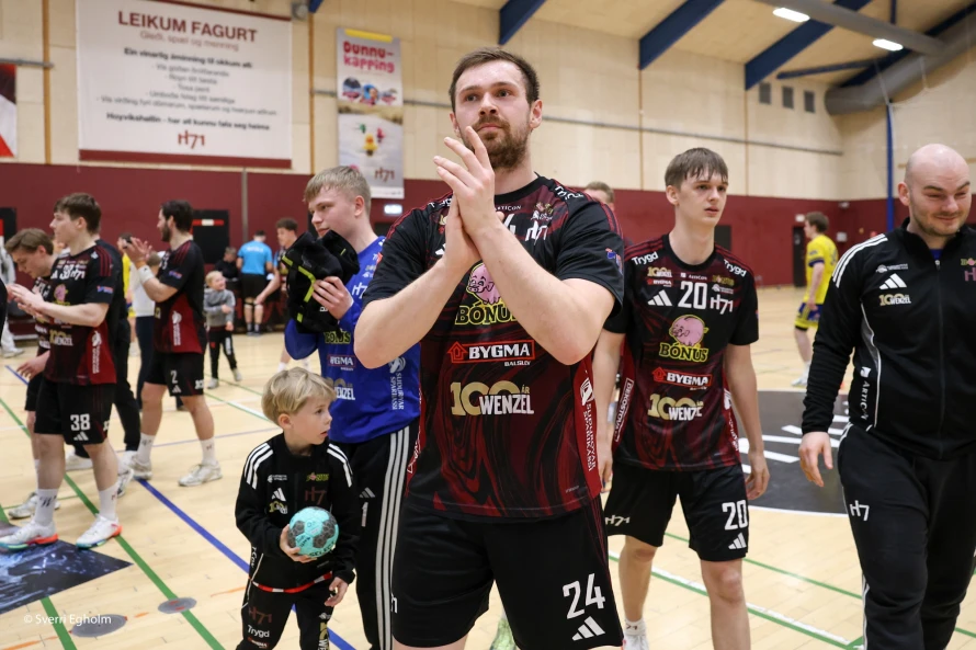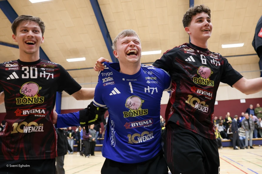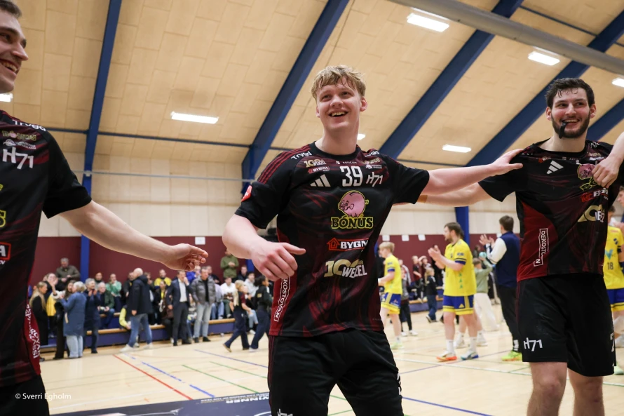 [object Object]Jákup Egholm (í miðjuni) var við at syrgja fyri, at hetta ikki varð seinasti dystur hansara við H71 á hesum sinni: Vinstri vongurin skoraði níggju mál - hann var eisini toppskjútti í finalu nummar tvey leygarkvøldið