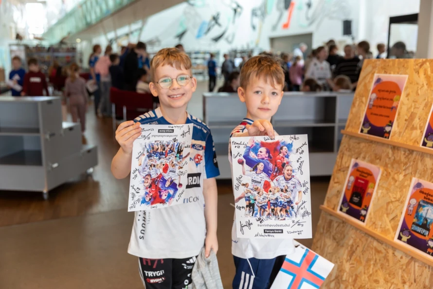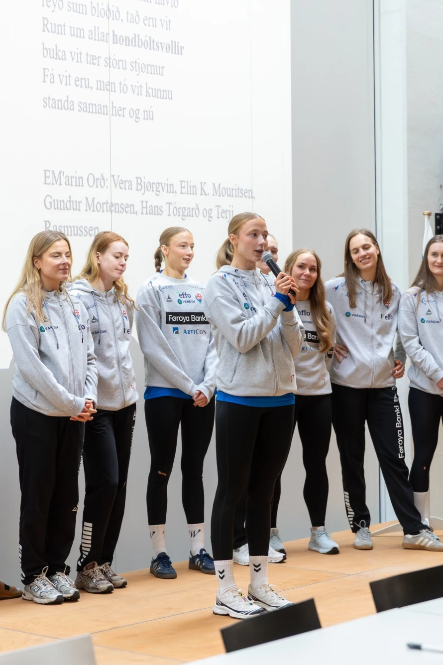 Hondbóltssamband Føroya skrivar eisini, at ølll sungu "Tú alfagra land mítt", og til síðst fingu øll høvi at fáa autograf frá kvinnunum, sum mikudagin vunnu á Portugal.