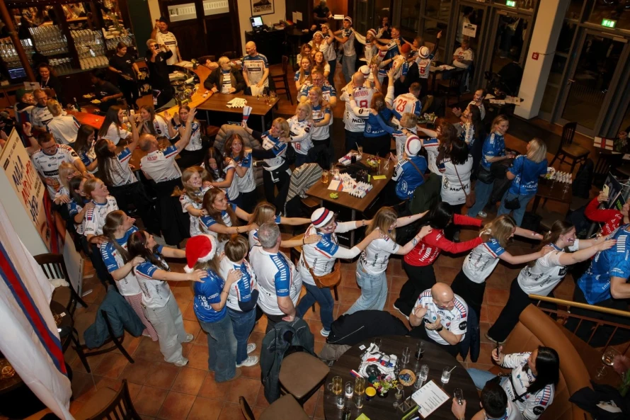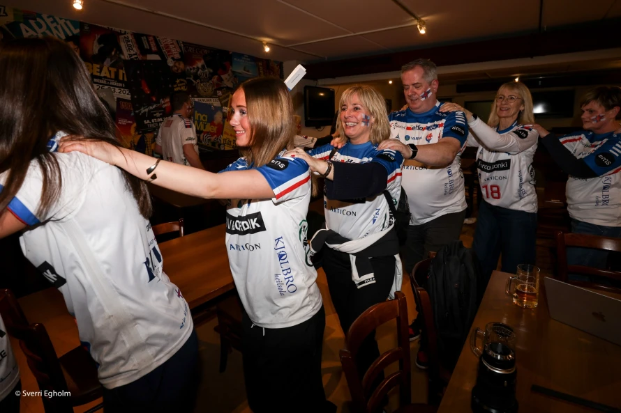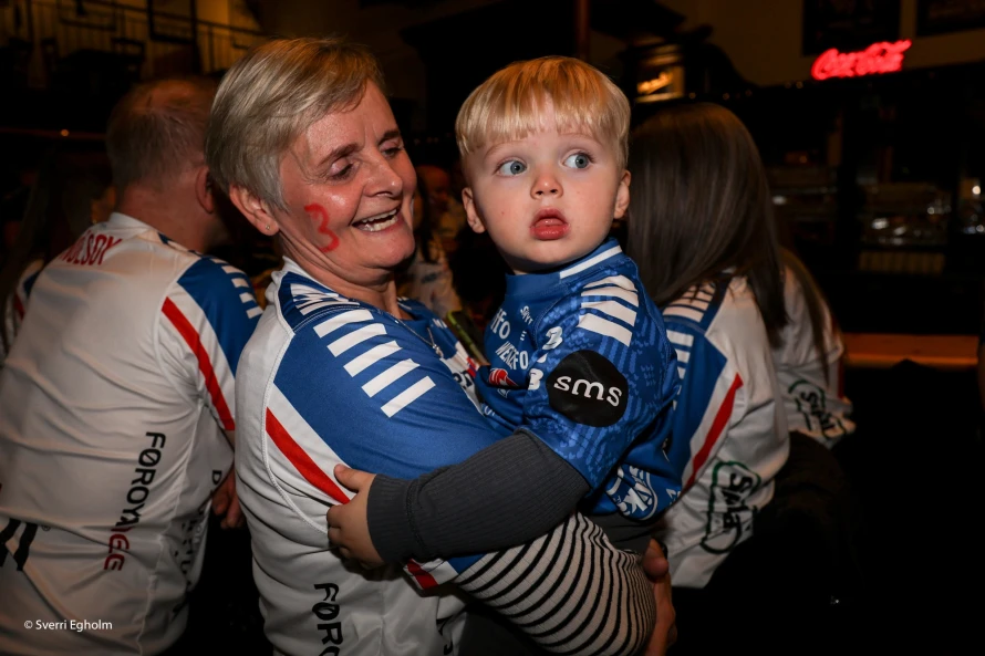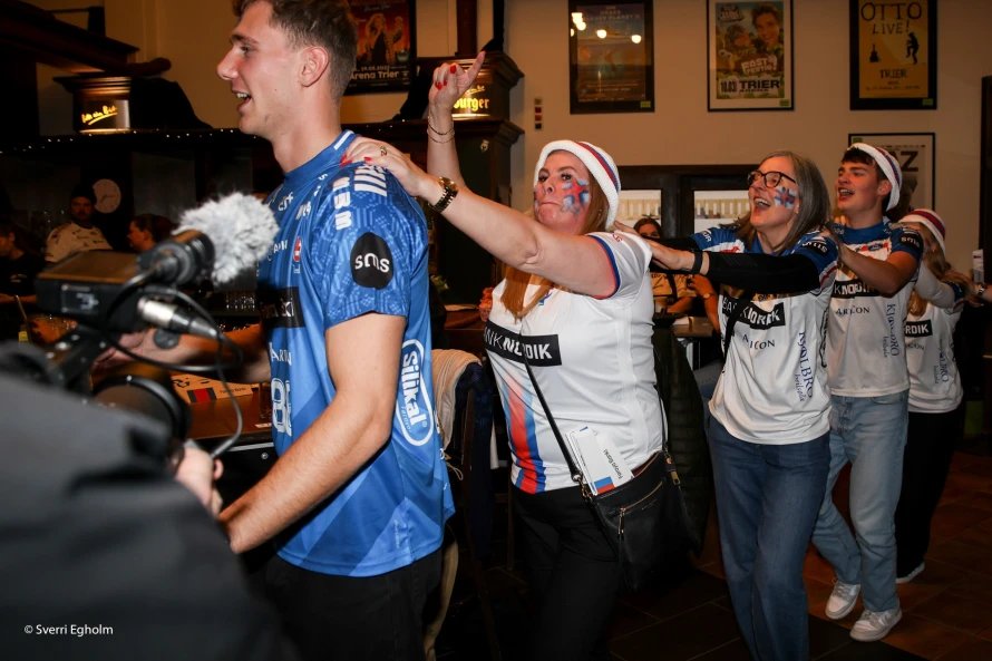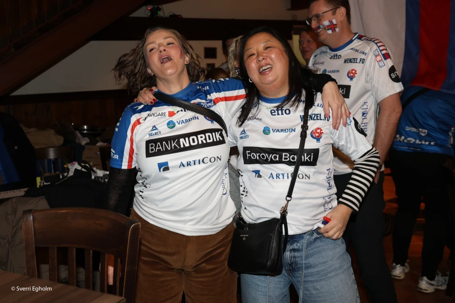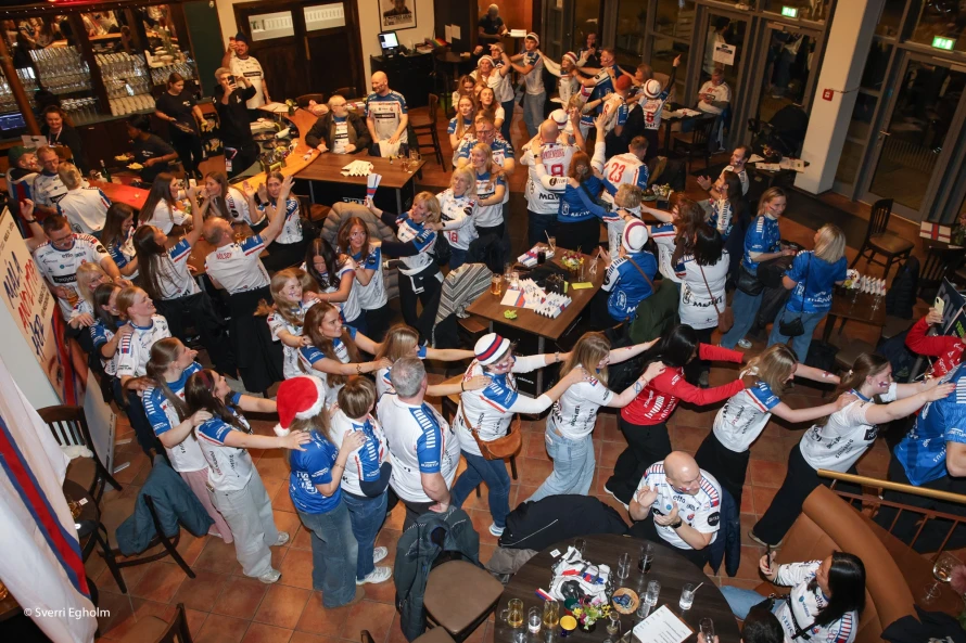Plátuvendararnir, ið kalla seg DJ Wenzel syrgdu fyri tónleikinum, og rey/blá/hvítu føroyskir fjepparar syrgdu fyri stemninginum í mathøllini, sum liggur í tilknýti til høllina Trier Arena.