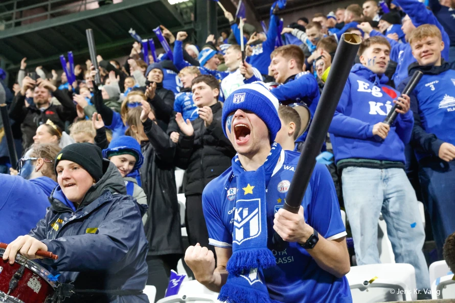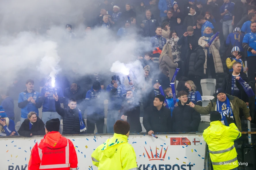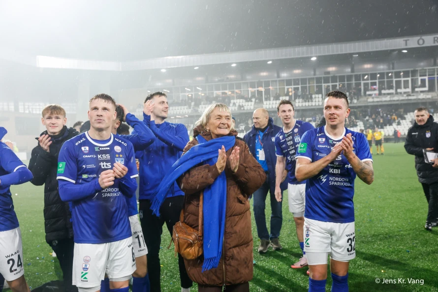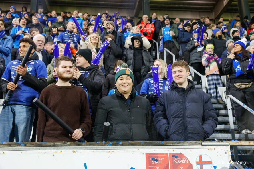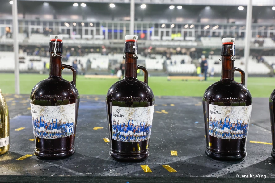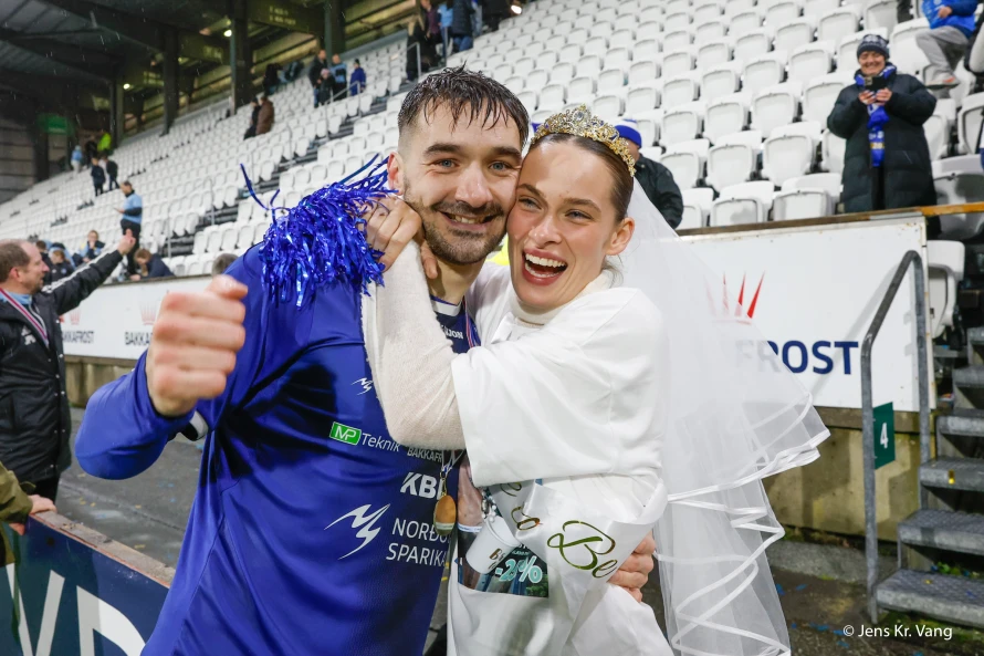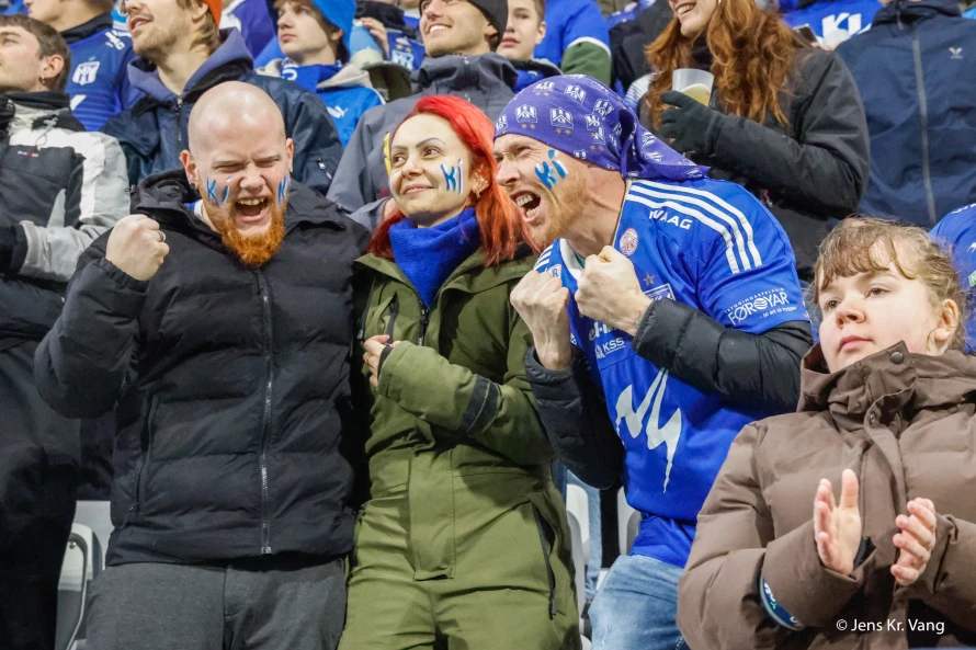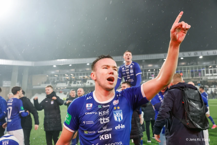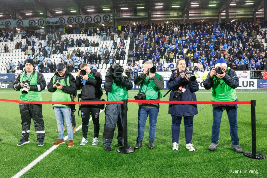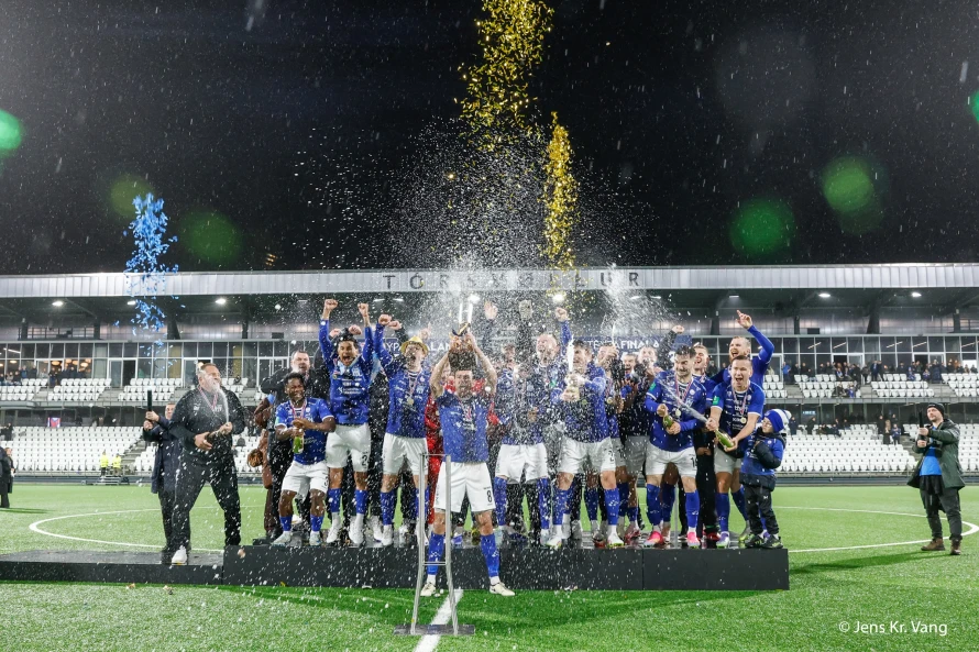 Spælarar, familja og øll rundanum KÍ í sigursrúsi eftir seinasta bríksl. Jákup Biskopstø Andreasen lyfti løgmanssteypið sum fyrsti KÍ'ari síðani 2016 - sí fagnaðarmyndirnar sum Jens Kr. Vang tók.