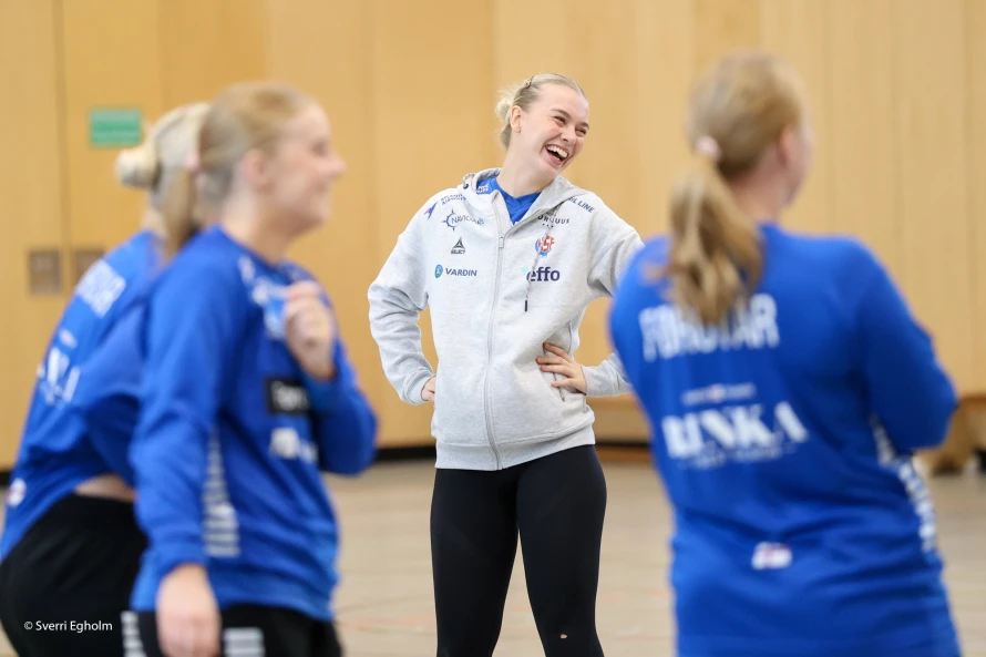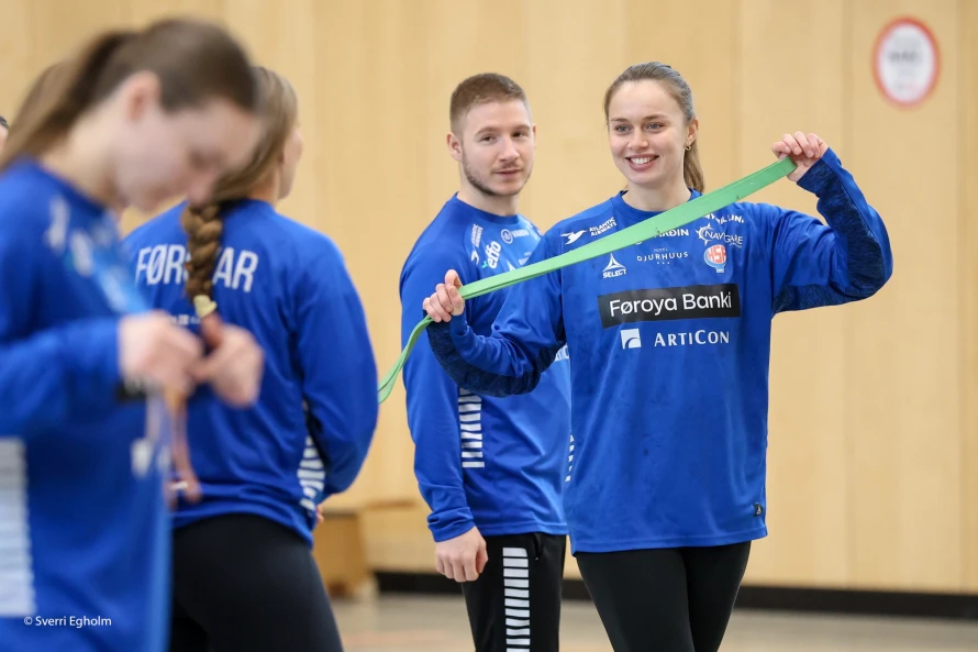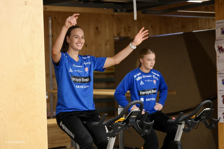 Men fleiri at spælarunum luttóku ikki í sjálvari skot- og rennivenjingini, men sótu ella stóðu út við veggin og gjørdu strekki- og styrkivenjingar ella fingu viðgerð av fysioterapeutinum, Beintu Bendix Laursen.
